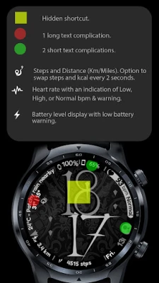• You can add up to 1 custom long text complication, 2 short text complications plus a hidden shortcut to the hour digit.